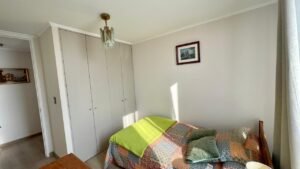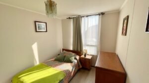 - Dormitorio pequeño: Cama 1.5 plaza, velador pequeño y cómoda