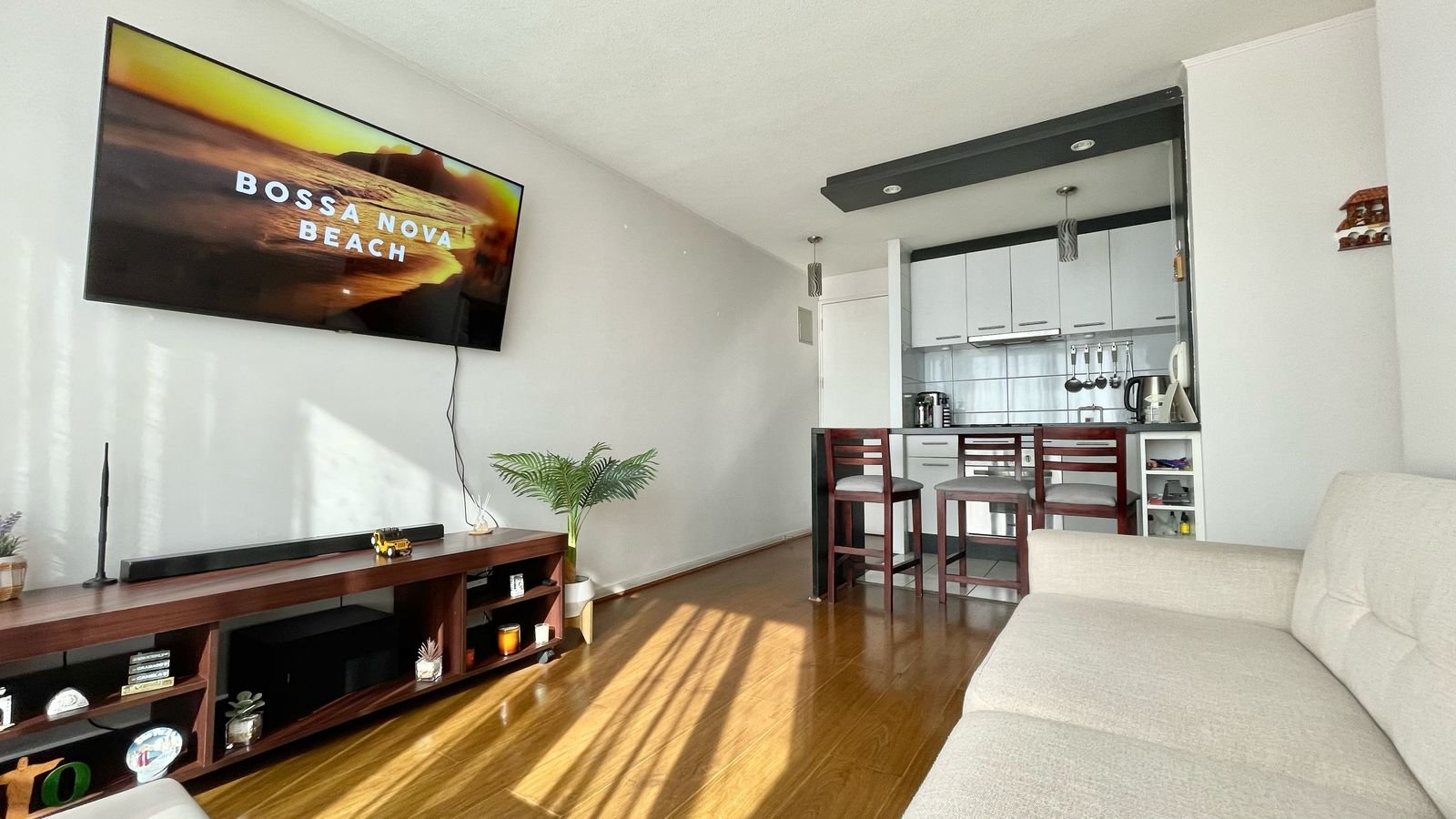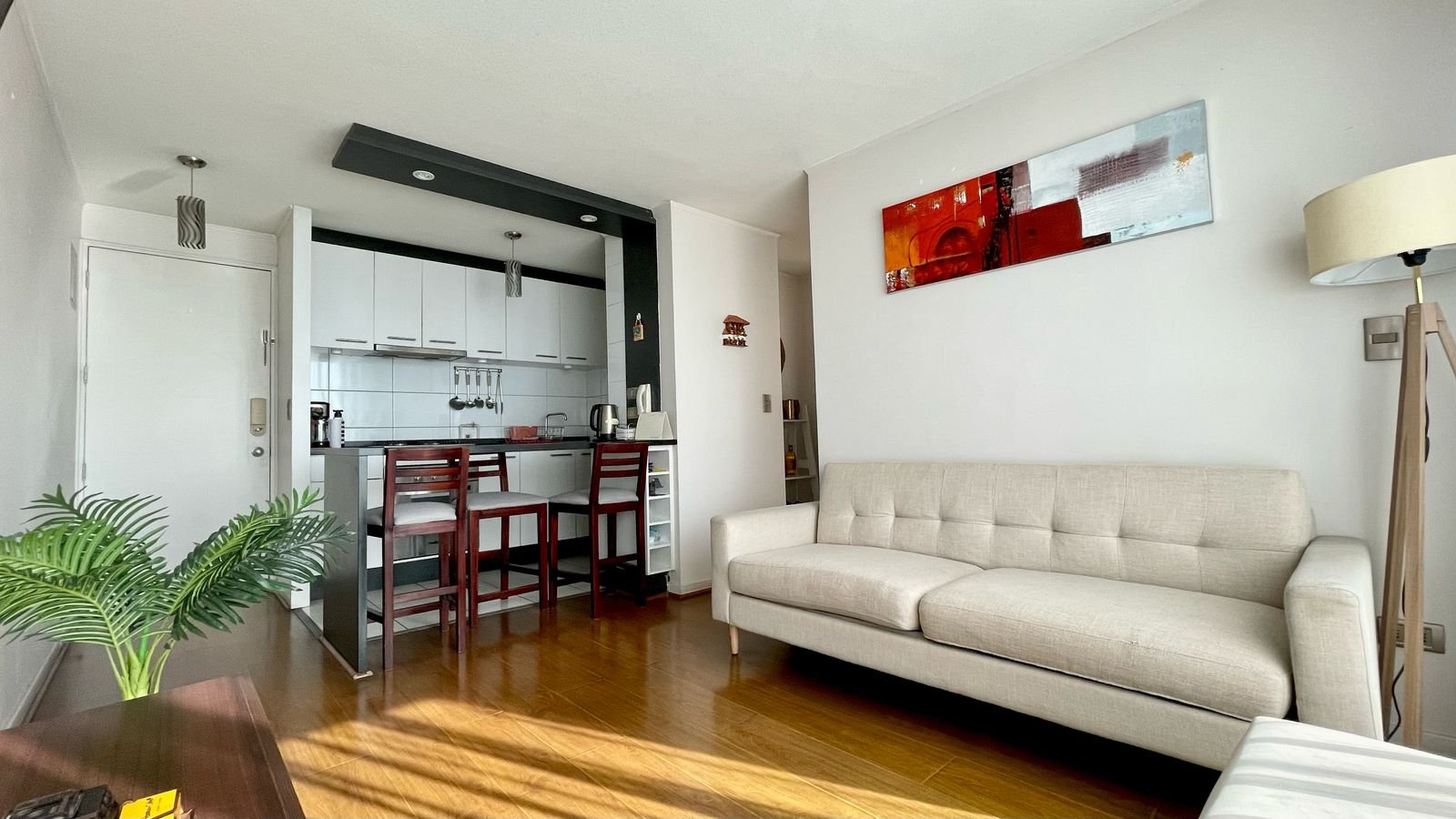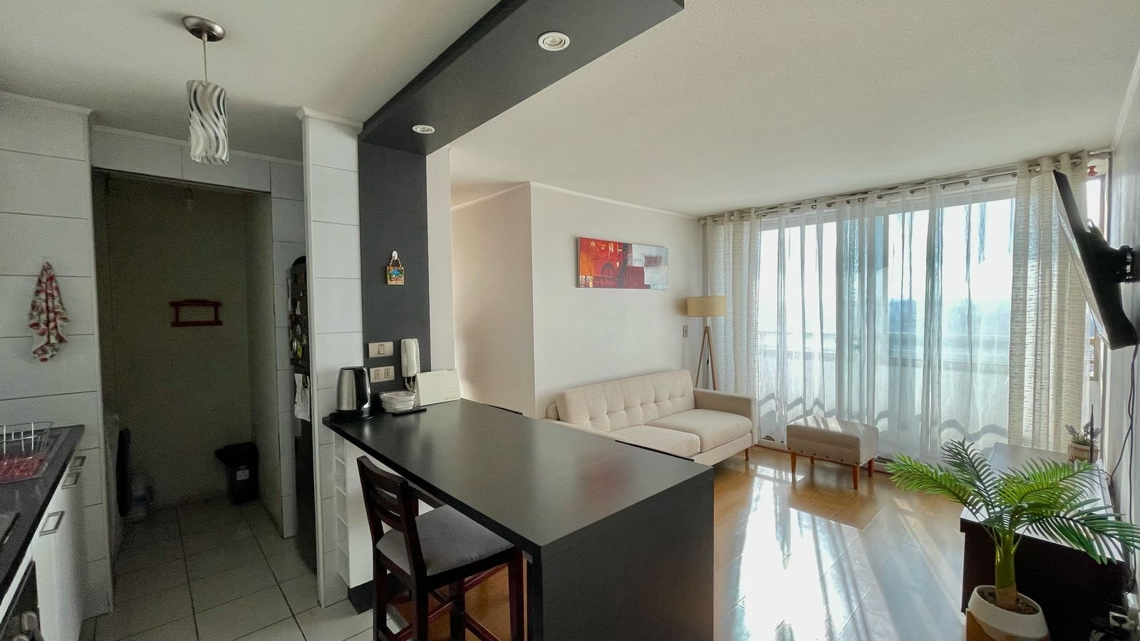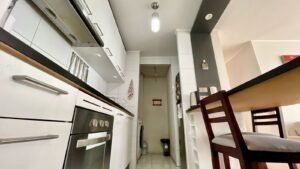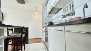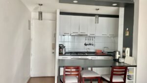 - Cocina americana amoblada y equipada con horno, encimera y campana.